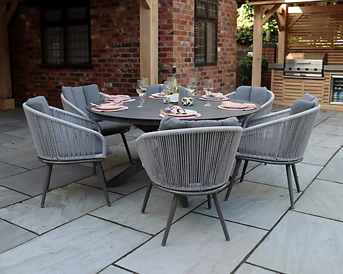 Royalcraft introduces the popular Aspen Dining Set – 6 Seater with Table. Modern and contemporary style with an aluminium framework construction and hand woven synthetic rope, it offers style, comfort, strength, fashion and durability. Complete with a round anthracite grey spray stone glass top table and six rope chairs including weather shield seat cushions, it is perfect for dining in style with family and friends.