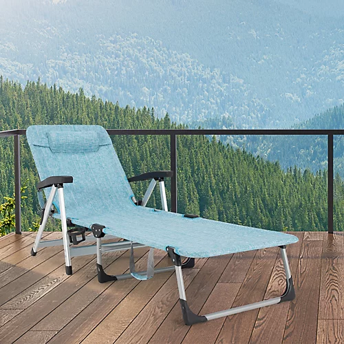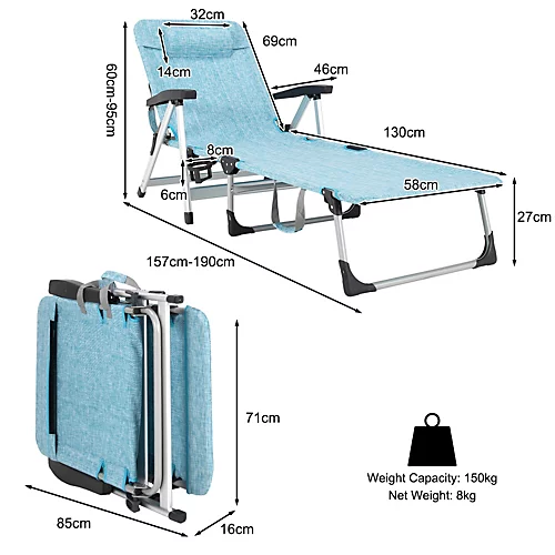 Our chaise lounge is suitable for both indoor and outdoor use. With its convenient foldable design, you can carry it with side straps for easy transportation and stored it in limited spaces. And you can adjust the backrest into 7 positions by simply moving the armrests back and forth until you find the ideal angle of backrest. Moreover, you can relax your head and neck on the thick padded sponge headrest. The surface of the sleeping recliner is made of high density fabric, which is featured by its excellent waterproof and breathable ability. Besides, our lounger with flat aluminum frame has stronger loading capacity up to 150kg.