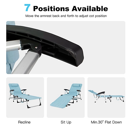 - 7 Adjustable Backrest Positions: By simply moving the armrests back and forth, you can get 7 backrest positions of the lounge chair. And you also have two choices of footrest positions during using. Hence, this sleeping cot can fully satisfy your daily requirements, like reading books, playing phones, watching TV or taking a nap.