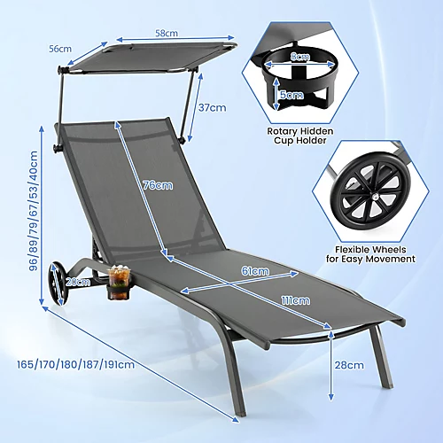 Different from other normal chaise lounge, ours is designed with sunshade. With the convenient adjusting knob, you can easily lift up or put down the canopy, and freely adjust its angle. Moreover, the 6-position backrest will meet more of your relaxing demands. The seat fabric is breathable to offer you more comfort. And the reinforced metal frame ensures high stability. Apart from that, when not in use, you can easily move the chaise lounge chair in or out with the functional wheels. And the hidden cupholder brings you more convenience to take drinks.