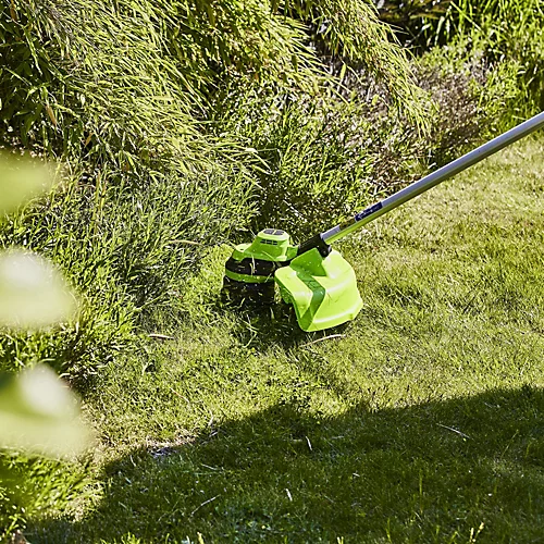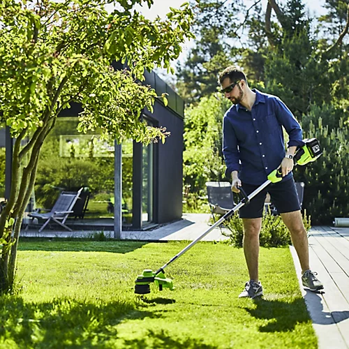 - PRECISE CORNERS AND EDGES in small to medium-sized gardens with the cordless trimmer thanks to the bump feed, the thread diameter of 2 mm and a cutting width of 33 cm