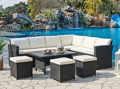 Introducing the Kos corner sofa garden set is the perfect addition to your home in the garden, patio or conservatory. The outdoor corner group set is made up of the following: Sofa Sets (Make Corner), Coffee Table, Cover, Back Cushion, Bench, Cushions, Seat Cushion/Pad, all seats come with thick and comfortable back and seat cushions with removable covers for easy cleaning. The garden set can seat up to 10 people.