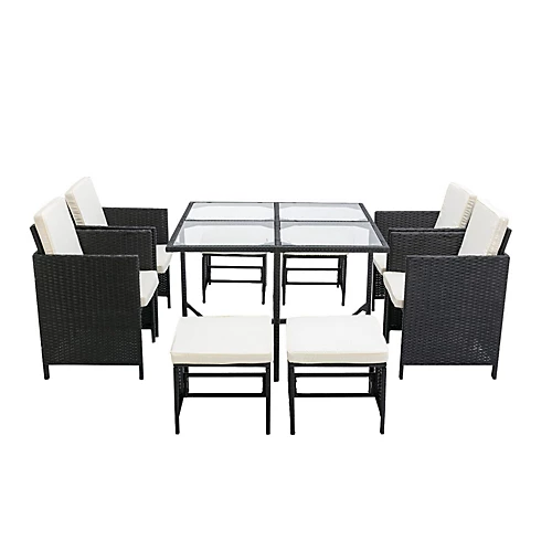 The hardened clear glass plate promises an elegant appearance. The arm chairs have a handle recess on the edge, allowing them to be easily moved. By means of the foldable backrest, the armchair and stool can be compactly combined in a modern system. This sleek modern looking rattan set will be a timeless set so that you will get to enjoy this great chair set for a long time to come. you’ll be able to change your garden, patio, balcony or conservatory and still be able to incorporate this timeless piece.