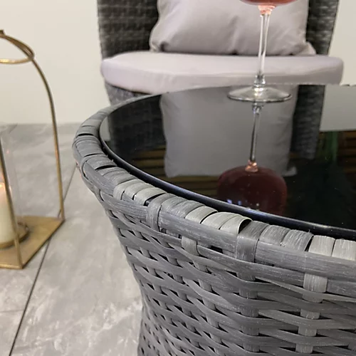 3 piece stacking rattan bistro set : 2 armchairs with cushions and a table with a 5mm black tempered safety glass top. This set can be stacked into a vase design and enables ease of storage due to its small footprint.