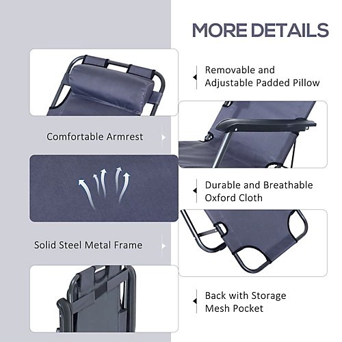 Features:• Foldable design for you to take it anywhere you want, compact when stored away • Sturdy steel frame for strength and reliability, crafted into a wide and long design for plenty of room • Oxford cloth seat, breathable and washable, provides even balance for all-day comfort relaxing • Backrest can be adjusted to two different positions to suit you • Detachable pillow provides comfort and support for your neck and head • The perfect lounger for relaxing in the garden, on the balcony and even on the beach • Maximum weight 136kg, no assembly required