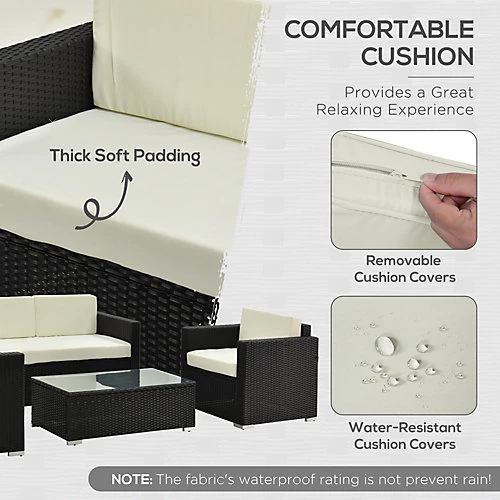 • Modern 4-piece detachable outdoor furniture set offers stylish and comfortable lounging at its best • Built from a galvanized steel frame with durable, weather-resistant PE rattan wicker for years of use • Zippered cushions filled with 4″ thick paddings for optimal comfort and relaxation • Washable cushion covers made from 220g outdoor water resistant polyester cloth for easy cleaning • Leveling feet adjust slightly to help raise or lower the set as you see fit • Tea table features 5mm thick tempered glass for decorative and functional use • Assembly required
