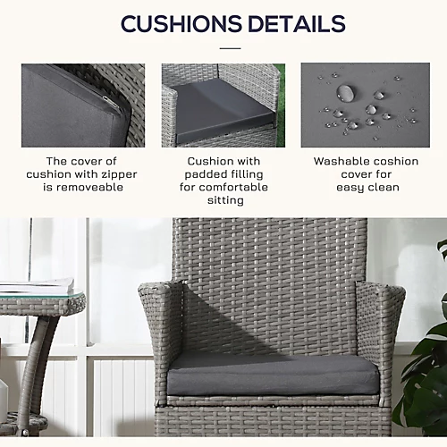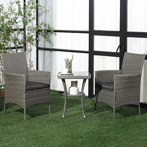 This Outsunny three-piece furniture is great for any patio, garden, porch and similar spaces. Frames made from powder coated steel mean a strong structure, wrapped in plastic wicker for garden rattan style. UV and water resistant. Matching table gives a handy side surface, with a safe and sleek glass top. Repeat and use, season after season.