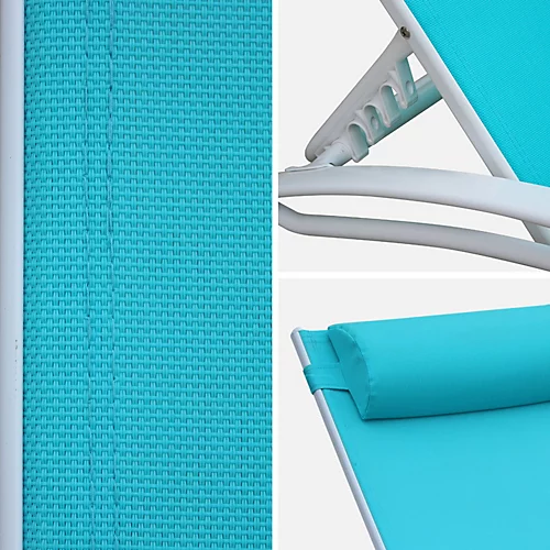 features:Complete lightweight setAdjustable backrestStacking sun loungersHead cushion included!Style:The Louisa is a classic timeless sun lounger. It is perfectly placed both at the edge of a pool and on a terrace. This anthracite / white sun lounger which is a great long term investment is both practical and comfortable. With a 4 level adjustable backrest the Louisa will adapt to your mood. Anthracite is a versatile colour similar to black but tinged with blue and grey undertones.Quality:The Louisa is an aluminium and textilene sun lounger. It is guaranteed to be durable as aluminium does not rust and textilene is resistant to poor weather. The Louisa is therefore a quality product and perfectly adapted to outdoor use. Its aluminium frame is powder coated in order to ensure an attractive uniform colour.Frame colour: WhiteTextilene colour: TurquoiseTechnical features:Aluminium frameComfortable The fabric adapts to your body and its honeycomb structure makes it breathable in hot weather.4 level adjustable backrest.StackingSturdy weather resistant fabric.Easy maintenanceDimensions:L167 x W64 x H82.5cm