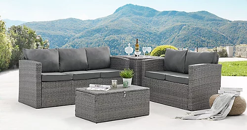 Introducing PALOMA, a grey rattan sofa and storage garden set with 1 x 3 seater sofa, 1 x 2 seater sofa, 1 x ottoman storage side table, 1 x ottoman storage coffee table and seat and backrest cushions. More and more of us are spending our summer holidays in the garden, maximising our personal space and saving money on pricey international travel! Any modern home can benefit from our collection of brown patio furniture, which features a chic wicker style made of PE rattan. Escape to your private refuge in your garden or patio to extend the length of the summer. Enjoy the bright weather while sitting with up to 9 family members and friends.