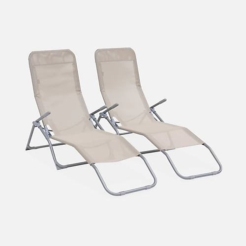 Folding sun loungersVery light and easy to store2 positions to choose from: sitting or lyingReclining chair with two positions to choose fromClassic Levito deckchairs will easily find a home in your garden. They’ll help you enjoy the sun in comfort. They can be adjusted to meet your needs as there are two positions available: sitting up or lying down. It’s easy to move between these two positions by using the armrests. Lightweight folding loungersThese loungers are practical foldable and lightweight for easy storage. They are also strong as the fabric is made of textilene. This is a perfect material for outdoor use and does not fade with the weather. In addition the fabric adapts to the shape of your body and allows it to breathe in hot weather. The structure is made of steel with a light grey epoxy paint.Dimensions:2x Armchair (highest position): L141 x W57 x H93.5cm2x Armchair (reclined position): L168 x W57 x H63cm2x Armchair (folded): L131 x W57 x H16cmSeat height: 26cmMaximum weight supported: 110kgWeight: 4.7kg