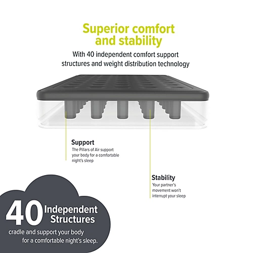 - Superior comfort and stability – 40 independent comfort support structures cradle and support your body throughout the night. These pillars are independently structured so when one person rolls over in the night, it won’t disturb the other’s sleep.